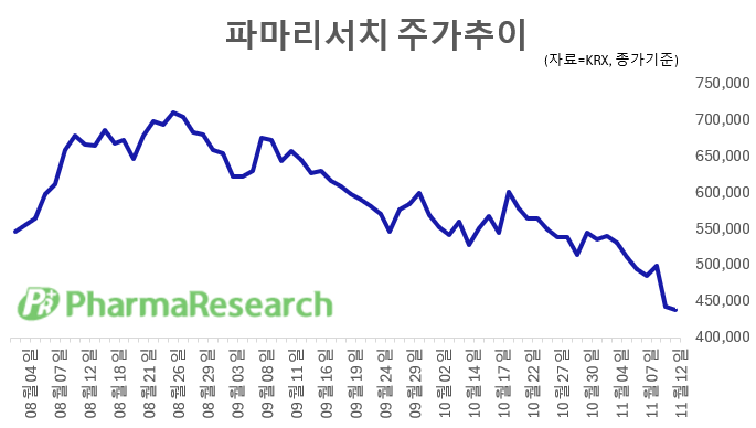 12일 한국거래소(KRX)에 따르면 오전 10시12분 현재 파마리서치는 전 거래일 대비 0.34%(1500원) 하락한 43만8500원에 거래되고 있다. 지난 8월 26일 사상최고점인 71만3000원을 터치한 이후 주가가 내리막을 걷고 있다.