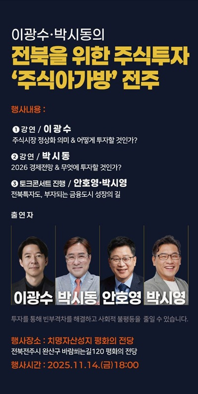 전주시 치명자산 평화의전당에서 오후 6시부터 열리는 토크콘서트는 독립리서치 광수네복덕방 대표로 진보적인 시각에서 경제평론을 이어가고 있는 이광수 평론가가 주식시장 정상화의 의미와 투자 전략을 주제로 강연을 펼친다.