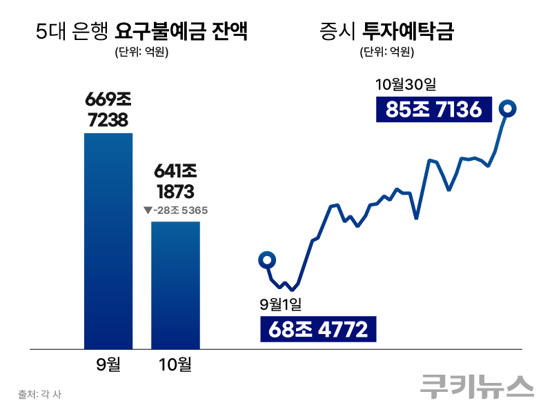 수신 부문에서는 질적 악화가 우려된다. 예금보호한도가 1억원으로 상향되면서 장기적으로 업권 간 수신 경쟁이 치열해진 데다, 증시활황으로 인해 안정적인 정기예금 비중이 축소되고 있다. 조달금리 상승으로 인한 수익성 하방 압력이 예상된다. 한 시중은행 관계자는 “증시가 계속 호조를 보이면 은행의 예금 자금이 증시로 이탈할 수 있다”며 “은행은 예대율(예금 대비 대출 비율) 규제에 맞춰 대출을 운용해야 하는데, 예금이 줄면 그만큼 대출 여력 자체가 줄어들 수밖에 없다”고 우려했다. 실제로 5대 시중은행(KB국민·신한·우리·하나·NH농협)의 지난 10월 말 요구불예금 잔액은 641조1873억원으로 집계됐다. 9월 말 669조7238억원에서 한 달 새 28조5365억원 급감한 규모다.