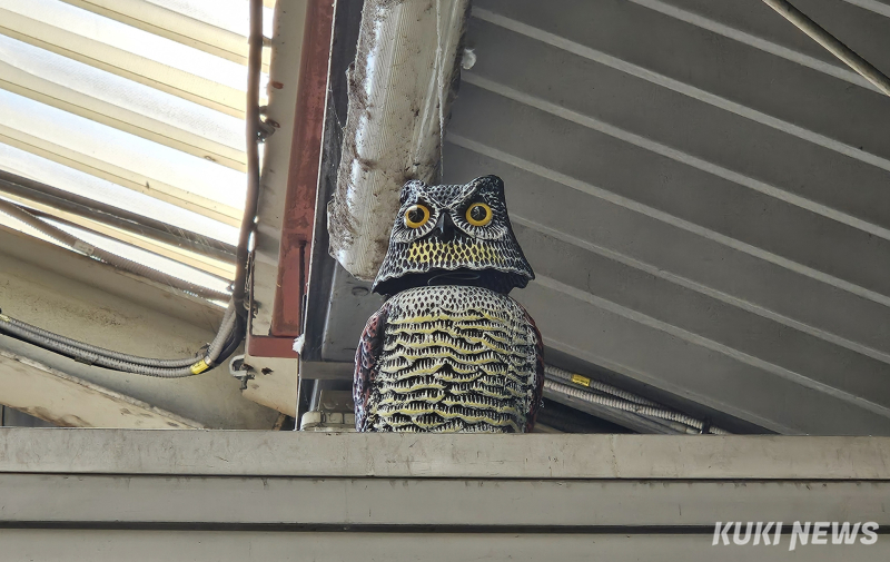 12일 찾은 2호선 대림역에는 부엉이 모형과 맹금류를 본뜬 연이 천장에 매달려 있었고, 주변 벽면에는 독수리 사진이 붙어 있었다. 해당 물품은 대림승무사업소 직원들이 자체적으로 돈을 모아 마련한 것이다. 서울교통공사 관계자는 “지상역이다 보니 비둘기가 많이 출몰하고, 승무원들이 교대하다 배설물을 맞는 일이 잦았다”며 “사업소에서 울며 겨자 먹기로 설치한 것”이라고 설명했다. 그는 “모형과 연은 지난 8월26일 배치됐고, 독수리 사진은 1~2년 전부터 있던 것으로 안다”고 덧붙였다.