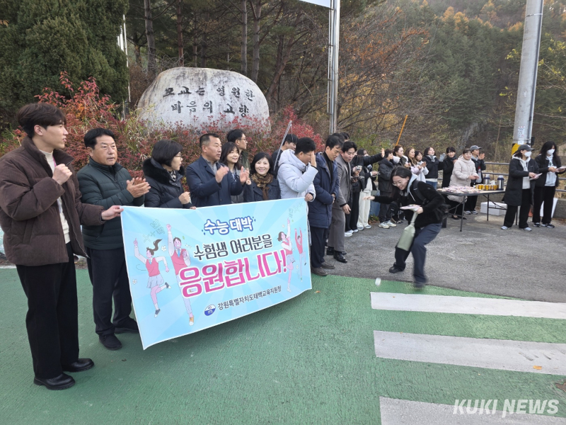 2026학년도 대학수학능력시험(수능)일인 13일 강원특별자치도교육청 제53지구 제6시험장이 마련된 태백시 장성여자고등학교 앞에서 학부모와 선생님, 관계자들이 수험생을 응원하고 있다.