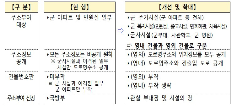 영내 군사시설은 지금처럼 보안지역으로 분류해 일반에 비공개를 유지하되, 택배 배송과 방문 편의를 위해 부대 출입구 접점에 도로명주소를 부여한다. 이에 따라 내비게이션과 인터넷 지도에서 ‘출입구 위치’까지는 확인할 수 있게 된다. 군사기지 내부 건물이나 시설의 구체적인 위치 정보는 계속 비공개로 관리된다.