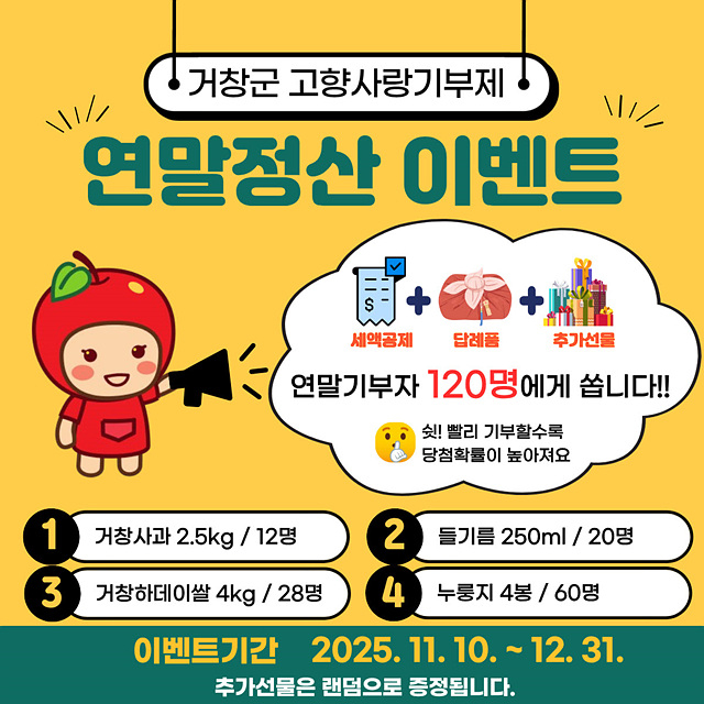 이번 이벤트는 12월31일까지 진행되며 기간 내 거창군에 10만원 이상 고향사랑기부를 한 기부자를 대상으로 총 120명을 무작위 추첨하여 추가 상품을 증정한다.