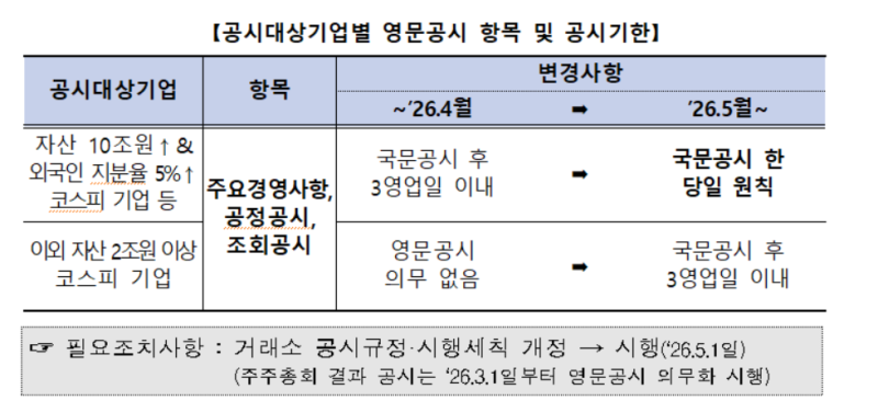 영문공시 기한은 현재 국문공시 후 3영업일 내에서, 10조 원 이상 대규모 코스피 상장사는 국문공시와 같은 날 제출하도록 하고, 그 외 자산 2조 원 이상 코스피 상장사는 국문공시 후 3영업일 내 영문공시를 내야 한다. 당국은 점진적으로 기한 단축을 추진할 예정이다.