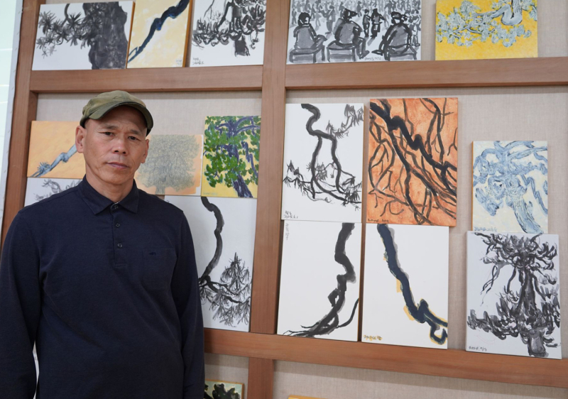 갑옷과도 같은 세밀한 소나무 껍질과 화면밖을 뛰쳐 나갈 듯이 생동하는 줄기, 사람들의 모습을 하나의 작품처럼 배치해 전시한 전시회 구성도 이채롭다.