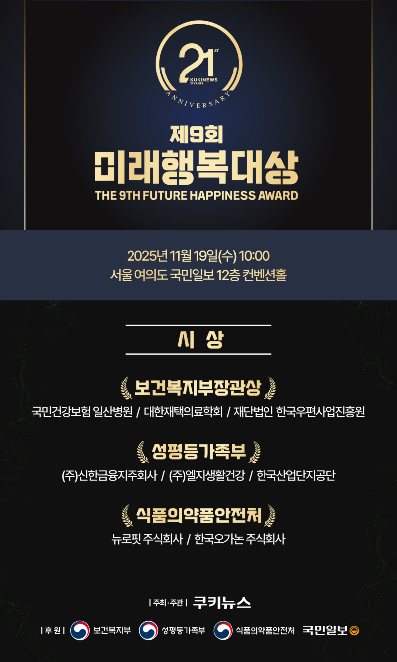 제9회 미래행복대상 시상식은 오는 19일 오전 10시 서울 여의도 국민일보 12층 컨벤션홀에서 진행될 예정이다.
