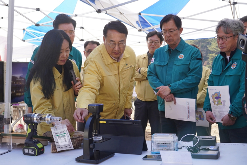 경북 영천시 화남면 소나무재선충병 방제사업지에서 감염 진단키트를 살펴보는 김인호 산림청장. 산림청