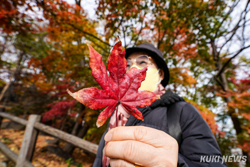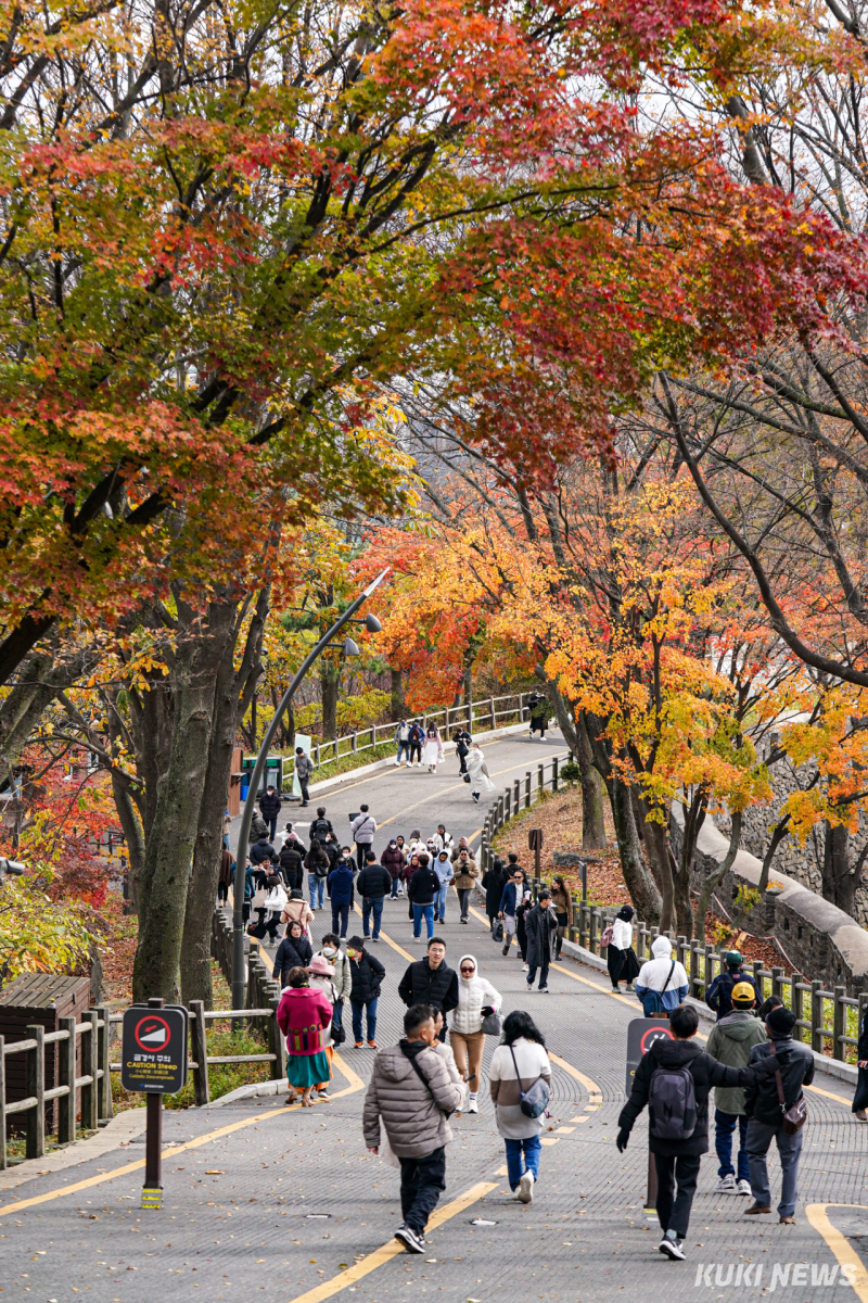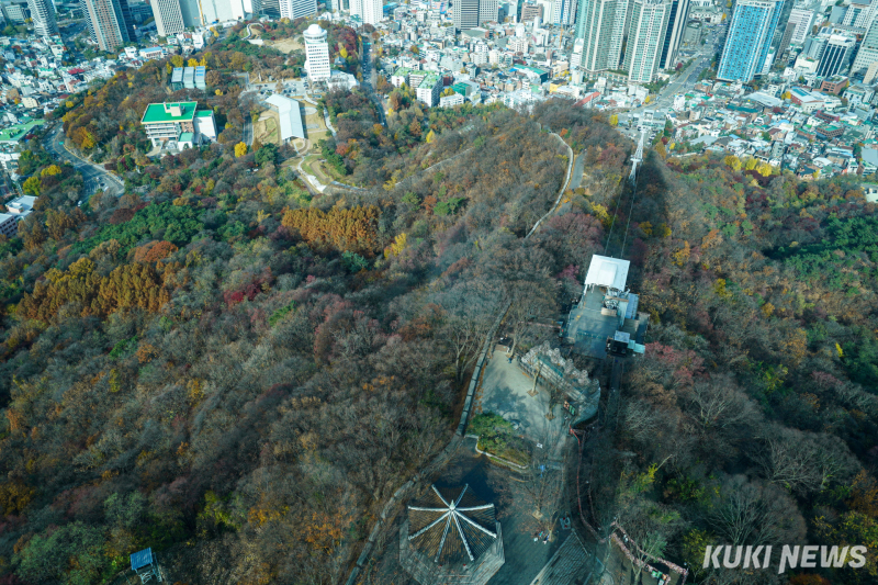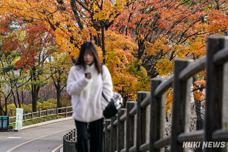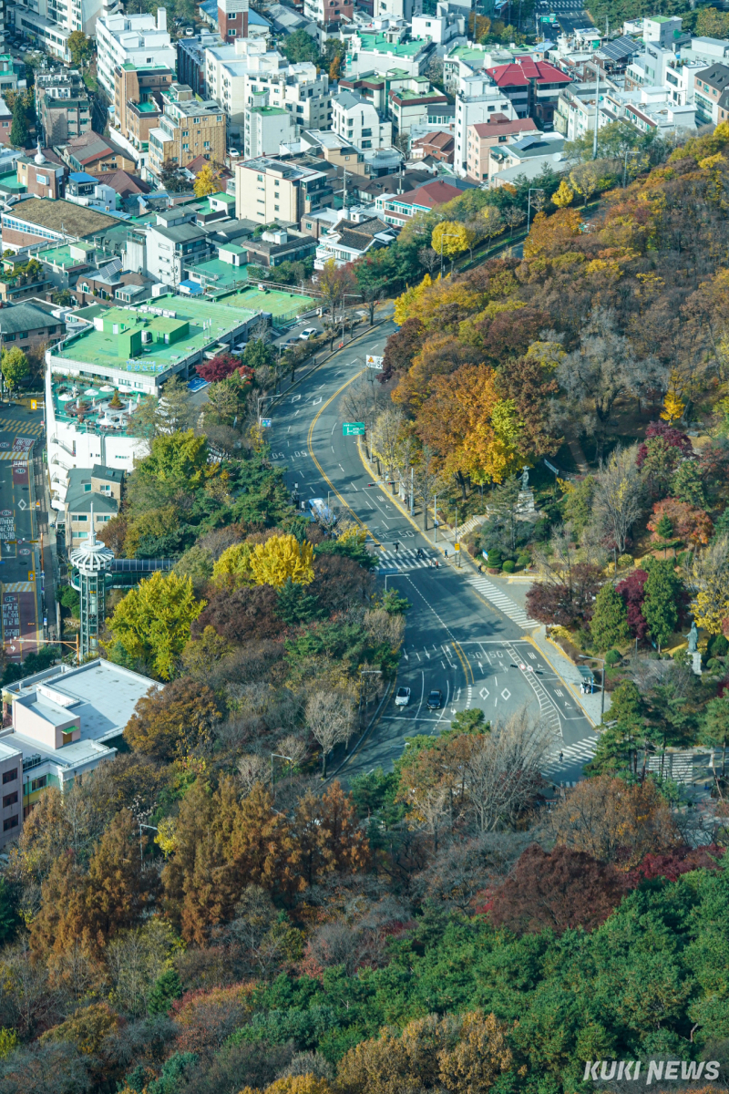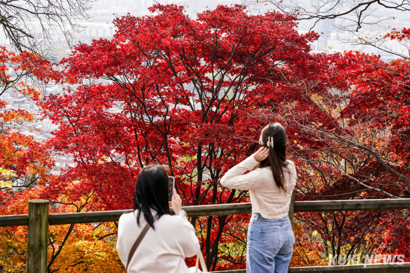 올해 단풍은 늦더위 영향으로 예년보다 일주일가량 늦게 물들었다. 산림청의 ‘2025년 산림 단풍 예측지도’에 따르면 중부권 단풍 절정기는 이달 4일로 전망됐다. 아침 최저기온이 1도까지 떨어진 이날까지도 형형색색 물든 잎들이 남산을 촘촘히 채웠다. 남산을 찾은 관광객들은 떨어진 단풍잎을 주워 들고, 알록달록한 가을 풍경을 배경으로 사진을 남겼다.