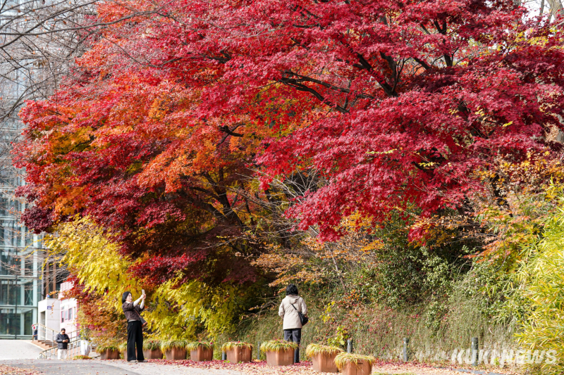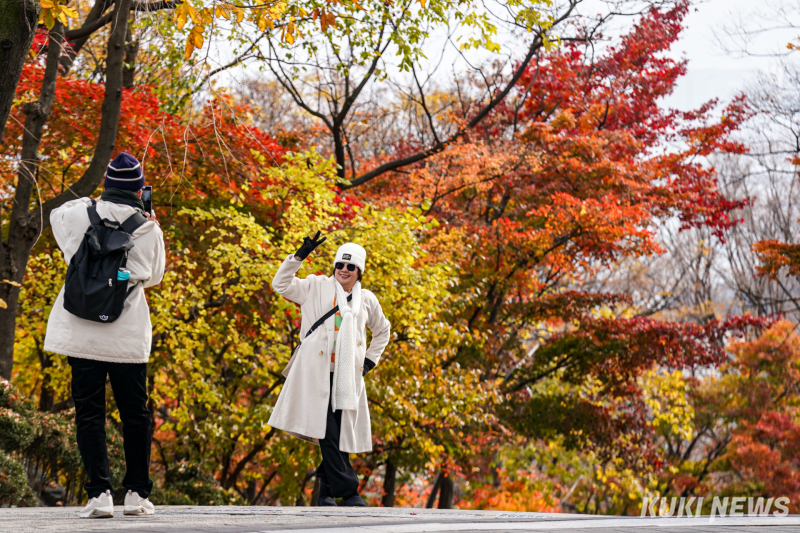 뒤늦은 단풍이 절정을 이룬 17일 서울 중구 남산공원 일원에서 관광객들이 형형색색 물든 나무를 배경으로 사진을 찍고 있다.