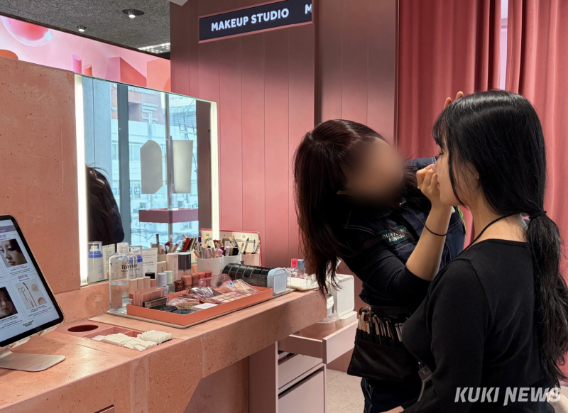 현장에서 체험한 ‘퀵 터치업’ 서비스도 외국인 관광객들의 높은 관심을 실감케 했다. 고객이 베이스·아이·립·브로우 중 원하는 메이크업 서비스를 선택하면 전문 메이크업 스태프가 약 15~20분간 즉석 시연을 진행한다.