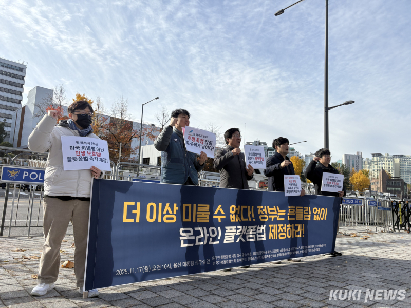 이날 서울 용산 대통령 집무실 앞에서 플랫폼 입점점주단체와 시민단체 등 ‘온라인 플랫폼법 제정 촉구 공동행동’이 주최한 기자회견에서는 “온플법은 통상 이슈에 가려 미뤄질 사안이 아니라 정기국회에서 반드시 처리해야 할 민생법안”이라는 주장이 제기됐다.
