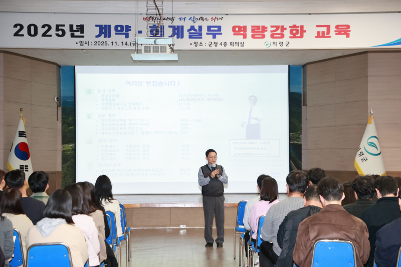 의령군은 14일 군청 4층 대회의실에서 군 소속 직원 120여명이 참석한 가운데 ‘2025년 회계·계약실무 역량강화 교육’을 했다.