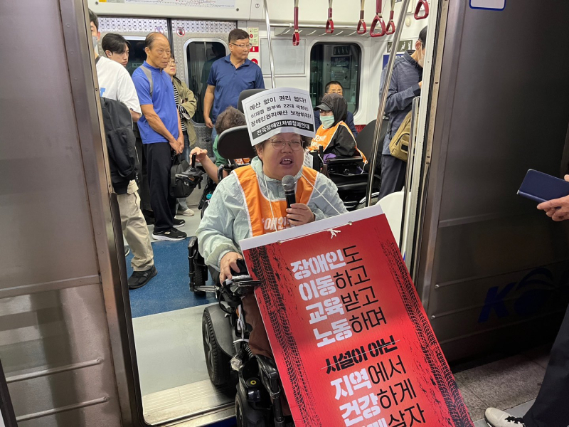 전장연은 2026년 정부 예산안에 장애인권리예산이 반영되지 않았다며 지하철 출근길 선전전을 벌이고 있다.