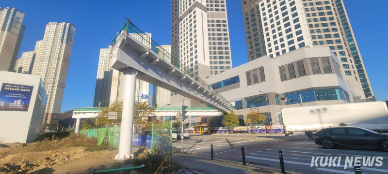 17일 아산시를 찾아 의문을 풀었다. 시 관계자에 따르면 이 설치물은 육교가 아니라 ‘공공보행로’다. 아산배방지구 지구단위계획 때부터 계획된 보행로라는 것이다.