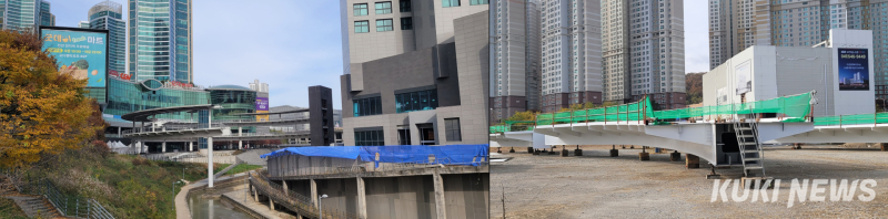 이 ‘공중보행로’의 지상 연결 시설물은 오피스텔 건너편의 상업지구쪽 건물이 설치해야 한다. 하지만 그곳은 아직 공터로 사업시행자도 아직 안 나선 상태다.