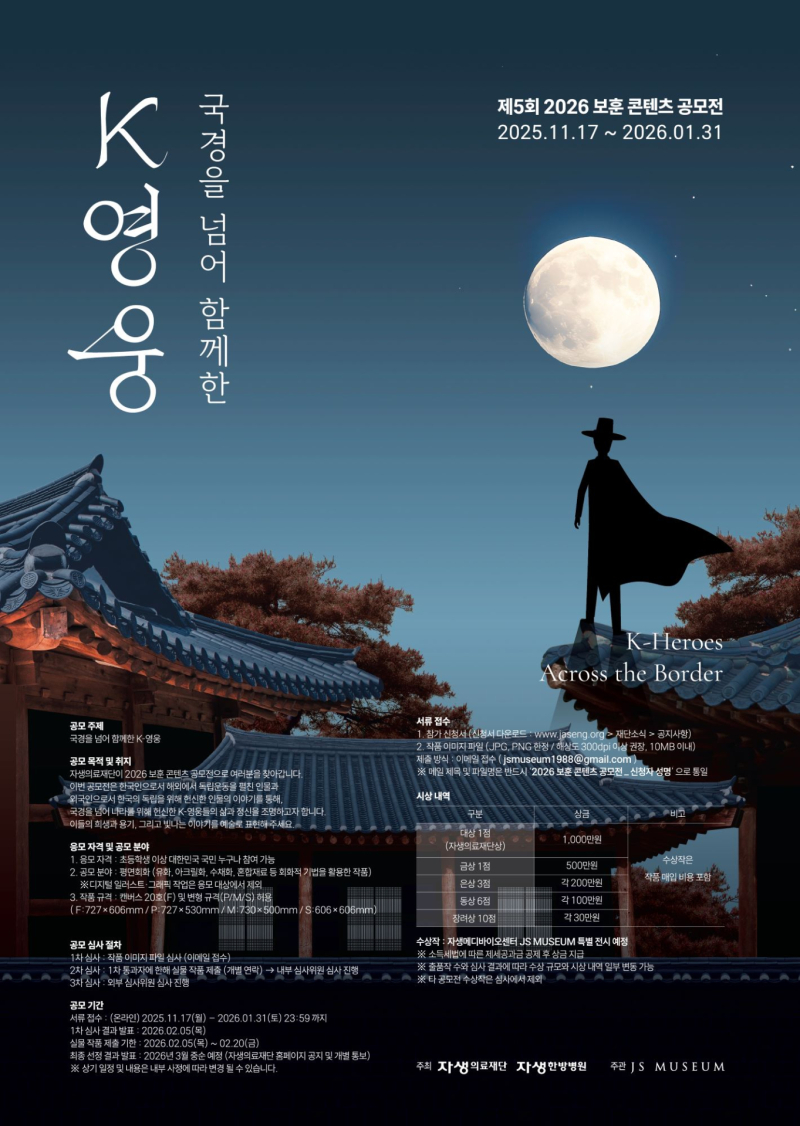 박병모 자생의료재단 이사장은 “대한민국을 위해 헌신한 K-영웅들의 숭고한 이야기가 이번 공모전을 통해 예술로 되살아나는 계기가 되길 바란다”며 “앞으로도 자생의료재단은 보훈 가치를 널리 알리기 위해 다양한 사회공헌활동과 적극적인 지원을 아끼지 않을 것”이라고 말했다.