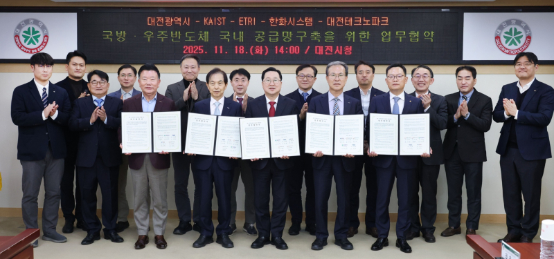 대전시는 18일 시청에서 KAIST, 한국전자통신연구원(ETRI), 한화시스템, 대전테크노파크와 ‘국방‧우주반도체 국내 공급망 구축을 위한 업무협약’을 체결했다.