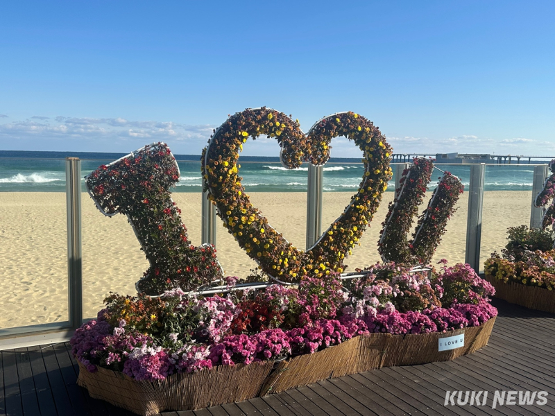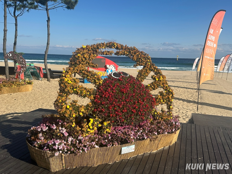18일 강원 삼척시 삼척해수욕장에 설치된 대형 국화 조형물들이 가을 햇살 아래 화사한 풍경을 연출하고 있다. 바다를 배경으로 한 국화 전시 공간이 마련되면서, 방문객들이 사진 촬영을 하며 여유로운 해변 산책을 즐기고 있다.