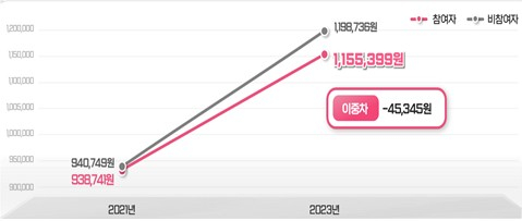분석 결과, 2022년 기준 참여자와 비참여자의 2021→2023년 의료비 증가 폭을 비교했을 때 참여자의 증가액이 4만5345원 낮았다. 참여자는 21만4650원, 비참여자는 25만995원 증가한 것으로 나타났다.