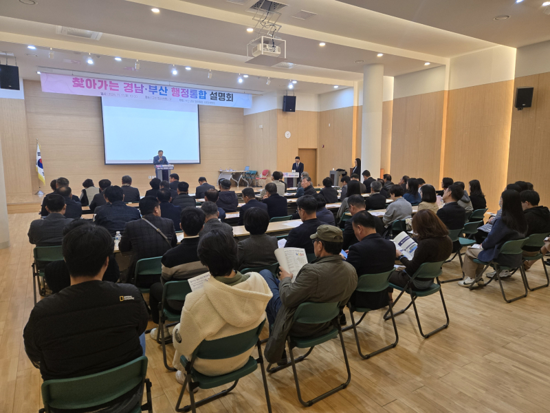 ‘2025년 찾아가는 경남-부산 행정통합 설명회’가 11월17일 고성군에서 도의원, 군의원, 읍면 이장협의회장, 주민자치회장, 군내 기관단체장과 공무원 등 고성군 여론을 반영할 수 있는 100여명이 참석한 가운데 개최됐다.