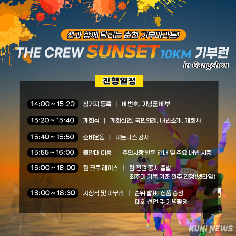 전국의 러닝 크루와 함께하는 '더 크루 선셋 10KM 기부런'이 오는 22일 강촌 북한강 일원에서 열린다. 이날 참가자들은 엘리시안강촌 리조트에서 출발해 백양리역 입구를 지나 북한강변을 따라 10㎞를 달리고, 완주와 함께 1인당 1만 원씩 기부해 나눔을 실천한다.
