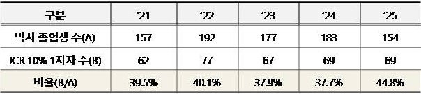 최근 5년간 성과를 보면 UST 박사 졸업생 중 JCR 상위 10% 학술지에 제1저자로 논문을 게재한 학생의 비율은 40% 수준이다. 특히 올해 44.8%까지 올라 역대 최고치를 기록했다.