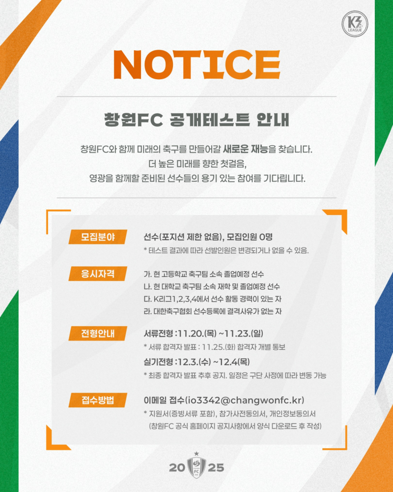 공개테스트 접수는 11월 20일부터 23일까지 진행되며 제출 서류와 지원 방법은 창원FC 공식 누리집 공지사항 게시판과 인스타그램을 통해 확인할 수 있다. 서류 합격자는 11월 25일 발표된다.