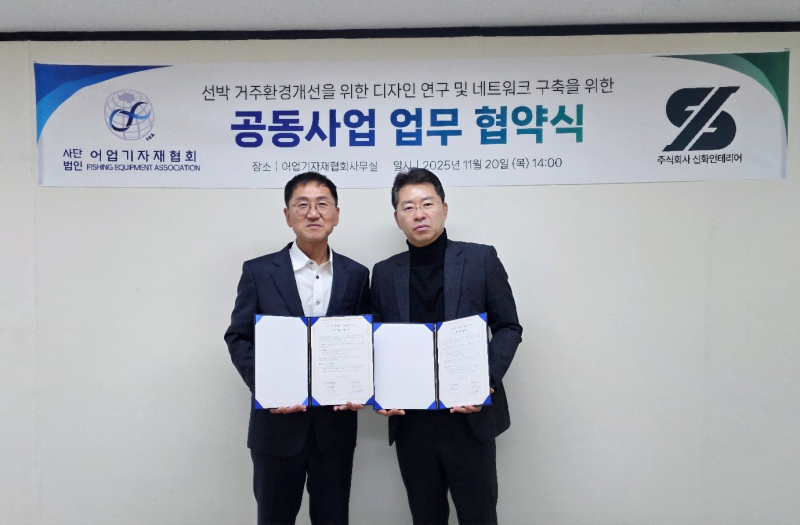 어업기자재협회와 신화인테리어는 20일 선박거주환경개선을 위한 디자인 연구와 안전 설비 강화 업무협약을 체결했다고 밝혔다.