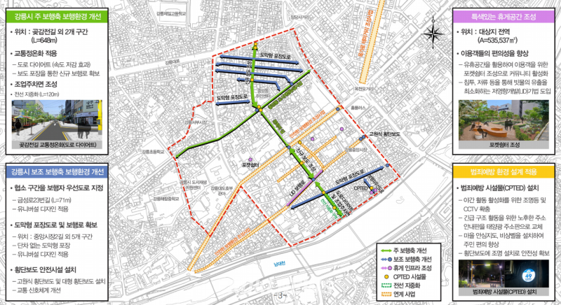 이에따라 이 일대는 주 보행축 도로다이어트 및 보도 확보, 보행자 우선도로 도입, 고원식·대형 횡단보도 설치, 포켓쉼터·녹지 기반 휴게공간 조성, 범죄예방 시설물(CPTED) 기반 야간 안전환경 강화 등의 공정이 진행된다.