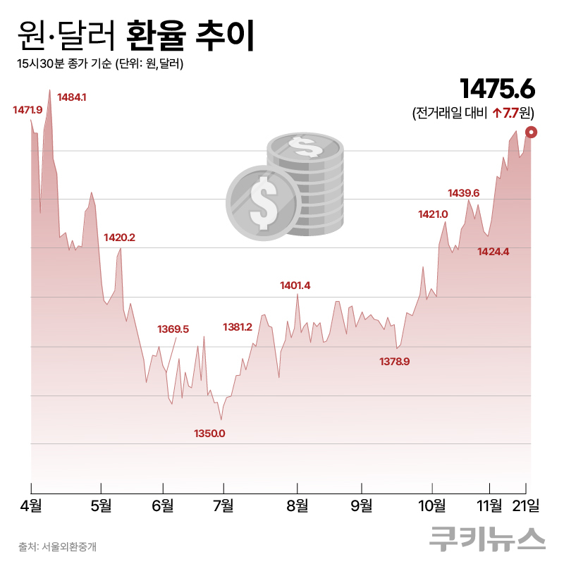 21일 서울 외환시장에 따르면 원·달러 환율은 전날보다 7.7원 오른 1475.6원에 마감했다. 장중 1476.0원까지 치솟기도 했다. 1470원대 환율은 미중 무역 갈등이 격화했던 4월9일(1484.1원) 이후 최고치다.