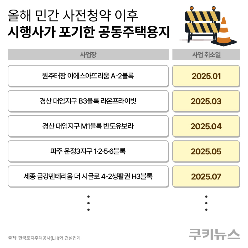28일 LH와 건설업계에 따르면, 올해 1~6월 LH로부터 공동주택용지를 공급받았다가 계약을 해지한 사례는 총 11개 필지로 집계됐다. 해지된 사업지는 원주태장2, 경산대임 B3·M1, 파주운정3 1·2·5·6블록, 세종 금강펜터리움 더 시글로 4-2생활권H3블록, 남양주진접2지구 분양연립주택용지, 인천영종 분양아파트용지 등이다. 상반기에만 이미 11건이 해지되면서 연간 기준으로는 20건을 넘길 가능성이 큰 것으로 전망된다.