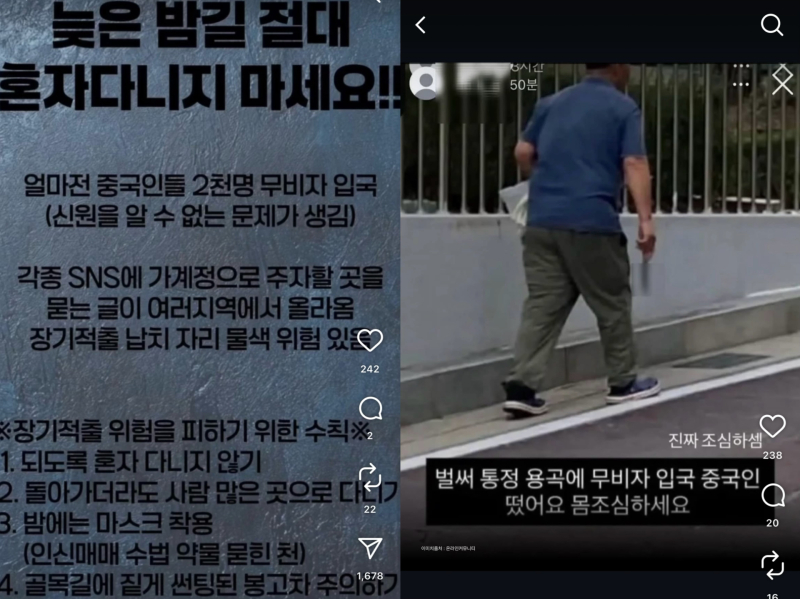 무비자 입국 시행 이후에는 “늦은 밤길 조심하라”, “중국인의 납치·인신매매 주의” 같은 경고성 게시물이 수십만 회 조회되며 공포가 증폭됐다. 이를 본 일부 네티즌은 “국가가 국민을 보호하지 못한다”며 불신을 표했고, SNS 타임라인에는 ‘불안을 공유하라’는 식의 재게시가 유행처럼 번졌다.