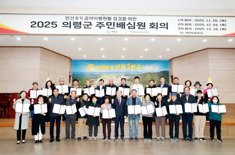 의령군이 20일 군청에서 민선8기 공약 이행을 점검할 주민배심원단을 공식 출범시켰다. 배심원단은 지역 주민 30명으로 구성되며, 군수 공약 추진 상황을 주민이 직접 평가하는 방식으로 운영된다.