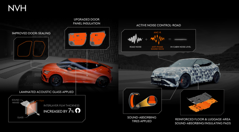 고성능 전기차에서 NVH(소음·진동·불쾌음) 확보는 가장 까다로운 과제다. 엔진 소음이 사라진 대신 노면·풍절음이 더 도드라지고, 고성능 타이어와 고속 주행이 기본값인 만큼 조건이 더 불리하다. 이부영 제네시스 소음진동시험팀 책임연구원은 “시속 200㎞ 이상 초고속 주행에서도 제네시스다운 정숙성을 유지하는 것을 목표로 개발했다”고 말했다. 연구진들은 풍동시험실에서 횡풍을 극대화한 조건으로 풍절음을 평가하고, 뉘르부르크링·아우토반 등 국내외 트랙에서 최고속까지 직접 주행하며 기준을 세웠다.