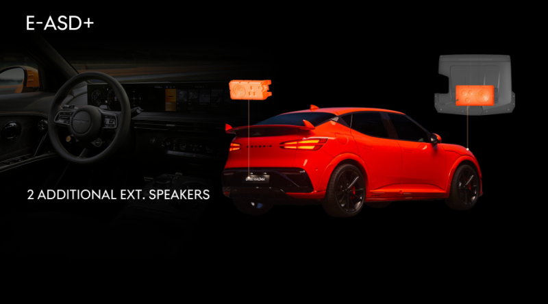 여기에 더해 GV60 마그마는 가상 변속과 연동된 감각적 인터페이스를 강화하기 위해 e-Active Sound Design Plus와 주행 향을 함께 적용했다. 김동규 제네시스총합시험팀 연구원은 “청각적인 요소가 중요한 고성능 차량의 특성에 맞게, 외부에 2개의 스피커를 추가로 장착하여 가상 사운드를 외부에서도 더욱 풍부하게 들을 수 있도록 구성했고 이를 통해 몰입감을 높였다”고 설명했다. 차량 외부 스피커를 추가해 고회전 엔진의 질감을 기반으로 한 마그마 전용 사운드를 실내·외에서 동시에 재현하고, 굿우드 페스티벌 오브 스피드에서 공개됐던 음원을 모티브로 전기모터 특유의 고주파 톤과 마그마 콘셉트의 에너지를 결합했다.