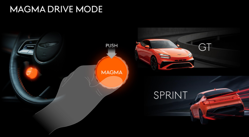 GV60 마그마만의 경험을 만드는 핵심은 ‘마그마 주행 모드’로 묶인 전용 주행 세팅과 감각적 인터페이스다. 스티어링 휠 좌측의 전용 버튼을 누르면 GT·SPRINT 두 가지 마그마 모드에 진입할 수 있으며, 각각의 모드에는 변속 로직·사운드·차량 반응성이 일괄적으로 연동된다.