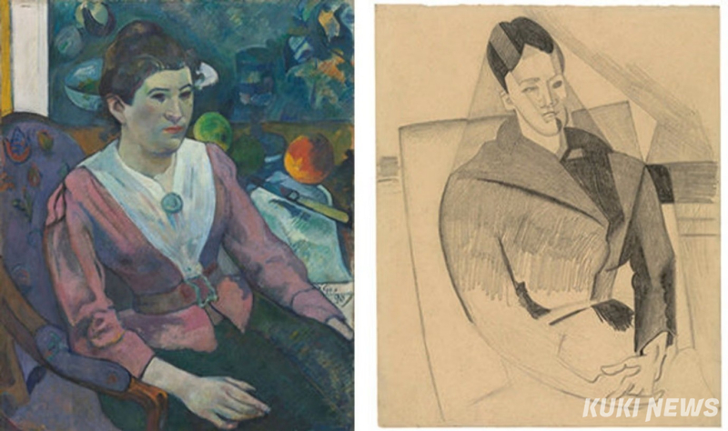 사진 오른쪽: 후안 그리스(스페인, 1887–1927), <세잔을 본뜬 세잔 부인의 초상>, 보리외(보리울레스로슈), 1916년. 흰색 종이에 흑연, 21 x 16.5cm, 메트로폴리탄 미술관