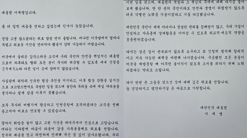 이재명 대통령이 지난 9월 미국 조지아주에서 이민 당국에 체포·구금됐던 한국인 근로자 300여명에게 위로 편지를 보낸 것으로 확인됐다.