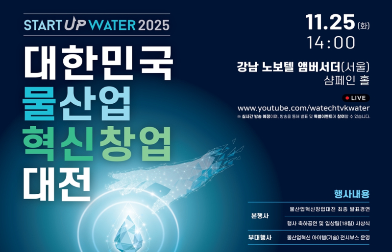 기후에너지환경부와 한국수자원공사가 25일 서울 강남구 노보텔앰버서더호텔에서 ‘대한민국 물산업 혁신 창업대전 2025’ 최종 경연을 개최한다. 우리나라의 새로운 성장동력으로 성장시킬 ‘혁신형 고성장 기업(유니콘)’을 발굴하기 위해서다.