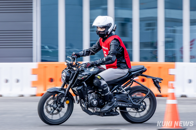 실기 교육이 시작되자 시승 바이크인 혼다 CB300R에 몸을 실었다. 혼다 CB300R은 주행 교육용으로 주로 사용되는 모델로, 초보자부터 숙련자까지 모두에게 적합한 바이크다. 주행 교육은 △짧은 직선 거리 주행 △회전 코스 주행 △장애물 피하기 △언덕 코스 오르기 등으로 이뤄졌다.