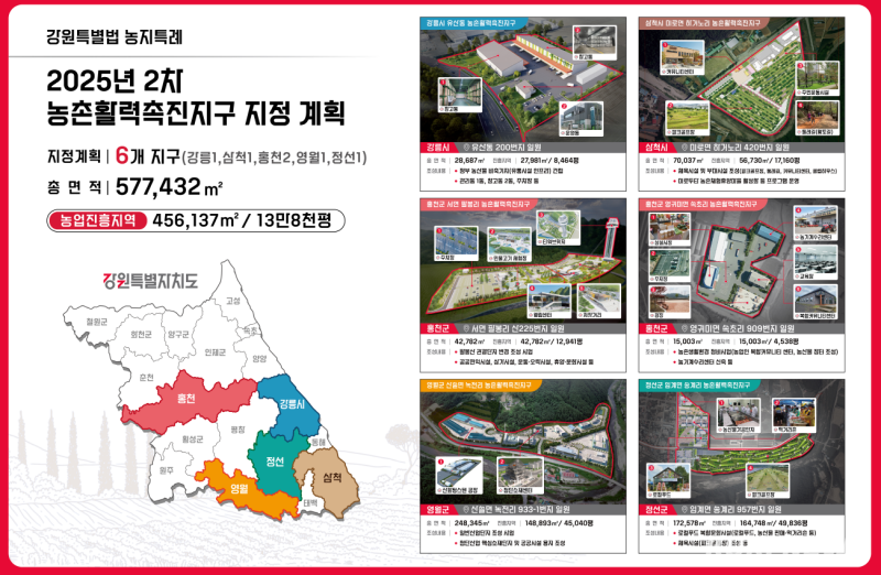 신규 지정된 6개 지구는 강릉 유산동 정부 농산물 수매 비축기지, 삼척 미로면 생활체육시설, 홍천 서면 팔봉산관광지 확장, 홍천 영귀미 농협농산물 판매장 및 복합커뮤니티센터, 영월 산솔면 첨단핵심소재단지, 정선 임계면 로컬푸드 복합문화시설이다.