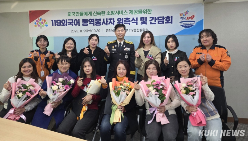 충남소방본부는 25일 도청 소회의실에서 ‘2025년 하반기 119외국어 통역 봉사자 위촉식 및 간담회’를 개최했다. 충남소방본부가 도내 거주 외국인 맞춤형 소방 서비스 제공을 위해 119외국어 통역 봉사자들과 머리를 맞댔다.