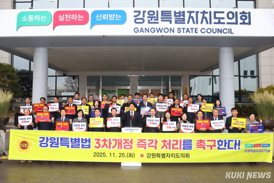 김시성 강원특별자치도의회 의장은 "300만 강원특별자치도민의 뜻이 담긴 이 법안이 더 이상 국회 문턱에서 머무를 수 없다"리며 "강원특별법이 실질적인 변화를 만들어내도록 국회가 책임 있게 움직여야 한다"라고 강조했다.