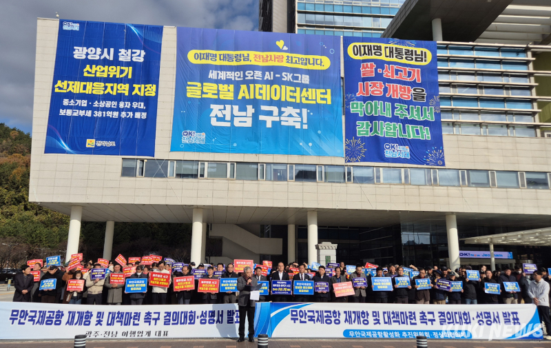 이들은 성명을 통해 무안국제공항 운항 일정이 내년 3월 이후로 미뤄지는 등 재개항 시점이 불투명해진 것을 ‘단순한 시설 복구의 지연이 아닌 국가 항공정책의 신뢰가 무너지고, 전남 서부권 주민의 ‘하늘길’이 봉쇄된 중대한 사태‘로 규정했다.