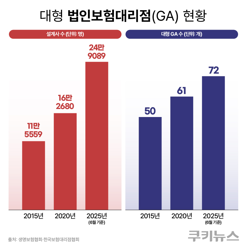 GA 소속 설계사는 2002년 약 3만명으로 전체의 10%에도 미치지 못했지만, 2016년에는 20만명을 넘어서며 전속 조직을 처음 추월했다. 2025년 상반기 기준 30만명 안팎으로 확대돼 전속설계사(20만8000명)의 1.5배 규모가 됐다.
