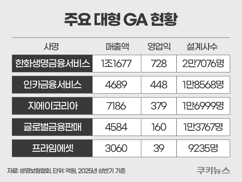 국내 최초 코스닥 상장 GA인 인카금융서비스의 경우 올 상반기 기준 설계사 1만8568명을 보유하고 있다. 매출 4689억원, 영업이익 448억원으로 웬만한 중소형 보험사를 능가하는 수준이다.