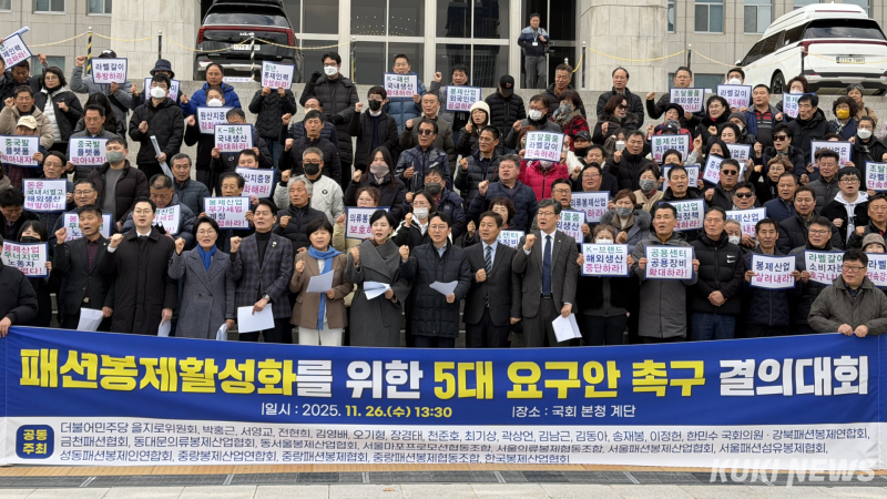 패션봉제협회는 26일 국회 본청 앞 계단에서 패션봉제 산업 위기 극복 촉구대회를 열고, 산업 활성화를 위한 5대 요구안을 제시했다. 이들은 △공동브랜드·공동판매 플랫폼 구축 및 판로 지원 △공동작업장 구축 지원 △패션봉제 인력 양성 △소상공인 전담 부서 신설 △패션봉제진흥법 제정 등을 제안했다.