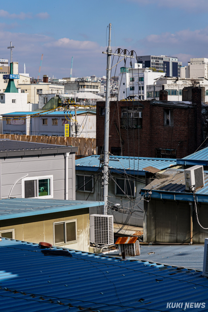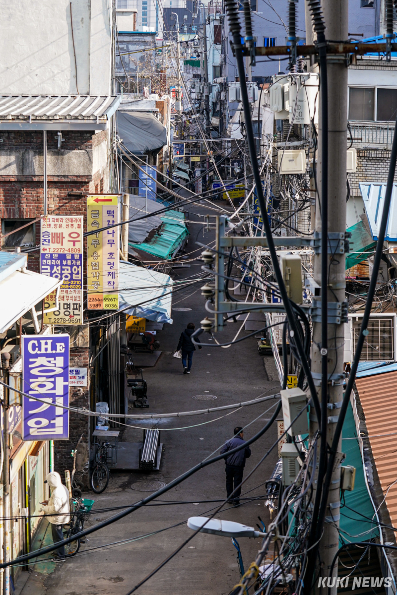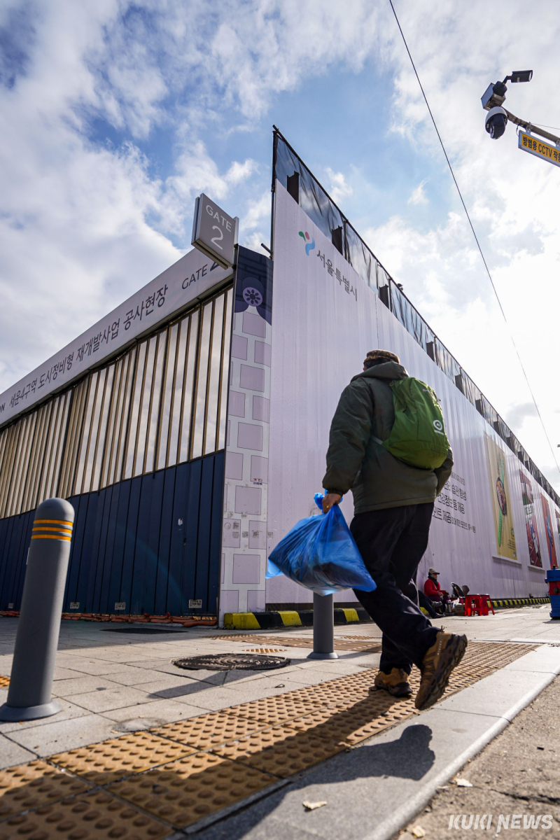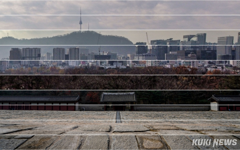 위 사진은 바로 그 ‘낮음’의 미학을 한눈에 보여주는 연속된 지평선이다. 아래로는 돌바닥과 제례 동선인 신로, 담장과 종묘정전남신문이 놓였고, 그 위로 나무숲이 층을 이룬다. 더 높은 시선에는 세운지구와 도심 빌딩이 포개지고, 맨 위로는 남산과 남산타워가 맞물린다. 단지 바라보는 높이를 조금 바꿨을 뿐인데, 일상적 눈높이에서는 보이지 않던 도심이 드러난다. 종묘와 도심이 얼마나 가까이 맞닿아 있는지, 그 거리감이 한 장면 속에 선명하게 잡힌다.