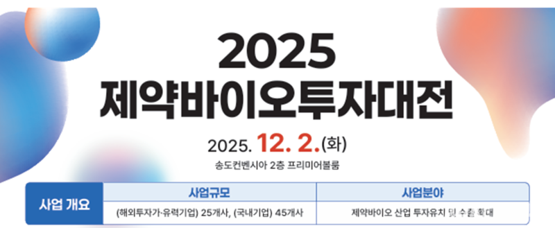 인천시는 오는 12월 2일 송도컨벤시아에서 인천관광공사, KOTRA, 한국제약바이오협회와 공동 주관으로 2025 제약바이오투자대전을 개최한다고 27일 밝혔다.