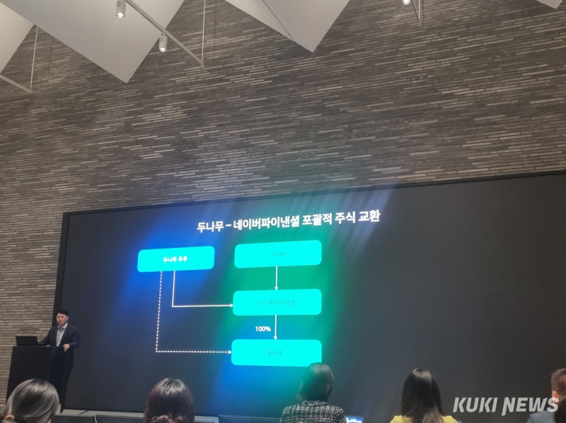 오 대표는 27일 네이버 사옥 1784에서 3사 공동 기자간담회를 열고 “두나무와 네이버파이낸셜의 결합은 글로벌 경쟁력 확보를 위해 양사 현금지출을 수반하지 않는 포괄적 주식 교환 구조를 택했다”면서 “두나무는 네이버파이낸셜의 100% 자회사로 편입될 예정”이라고 말했다.